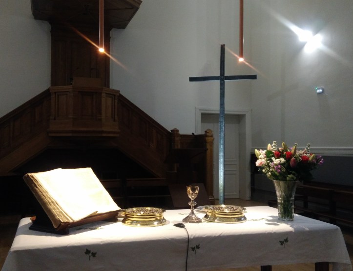 La Bible toujours posée sur cette table et le partage du pain et du vin au cours du culte nous redisent sans cesse l’amour inconditionnel de Dieu, qui que nous soyons, d’où que nous venions.