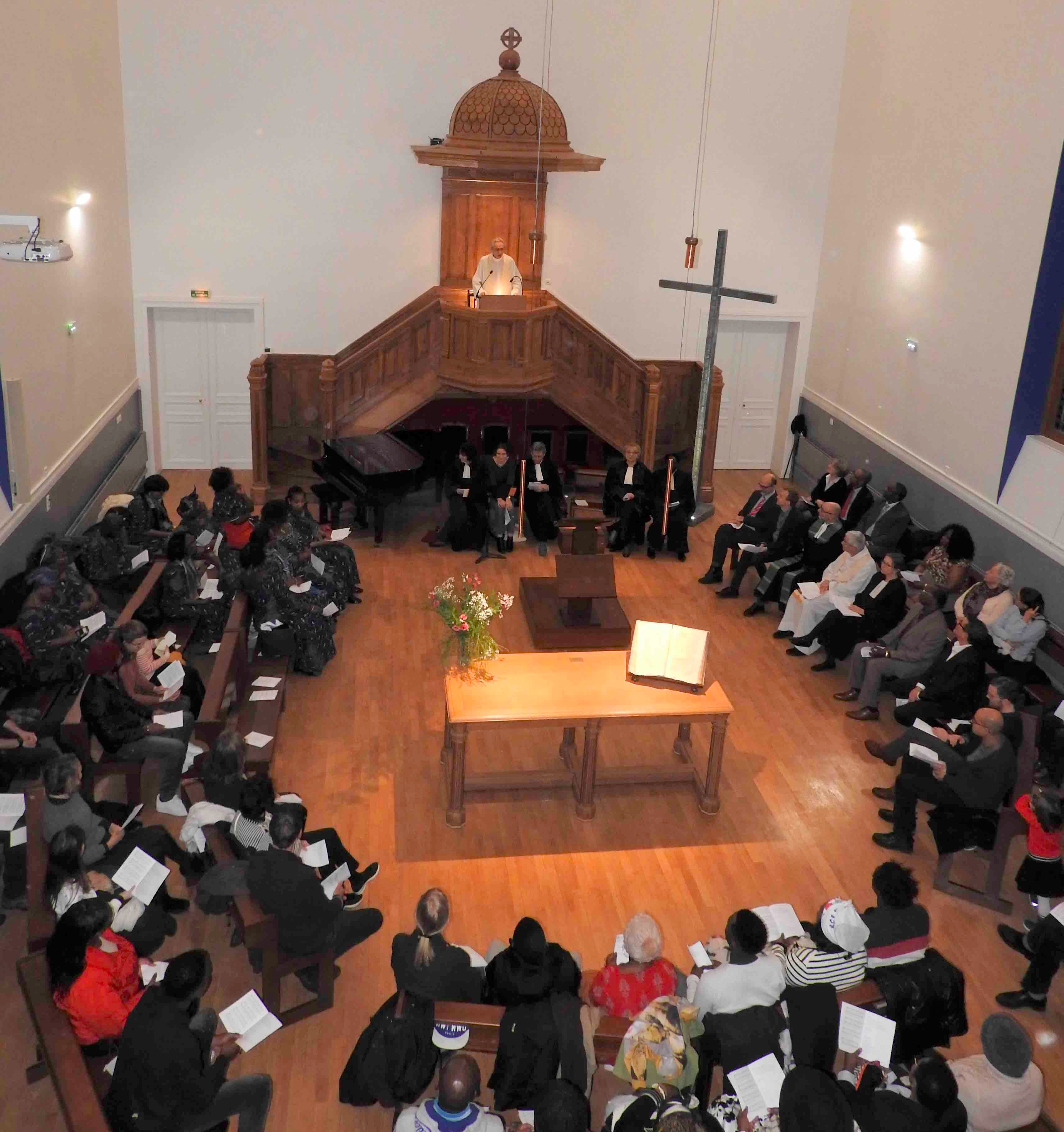 Sans doute le changement le plus remarquable est la disposition des bancs. De ce qui a été appelé le temple-autobus où on est les uns derrière les autres, nous avons choisi la forme circulaire, préconisée par les réformateurs. Elle signifie d’abord par la présence de la chaire en hauteur, la proclamation de la parole de Dieu à travers les Écritures, la disposition en cercle rappelant que cette parole offerte à toutes et à tous, conduit chacun dans la liberté et la responsabilité qui lui est propre, à méditer les Écritures, à les interpréter, à les critiquer même, pour y découvrir ce souffle de Dieu puissant et agissant dans sa vie. Cette proclamation touche, interpelle, nourrit individuellement et ouvre sur les autres, met en lien avec les autres, suscite le partage ; elle a un impact sur la communauté elle-même, d’où la disposition en cercle qui permet de se voir et d’échanger. Et vous aurez remarqué que la croix est dans le cercle, à côté de la chaire, nous rappelant que la proclamation de la bonne nouvelle de Dieu est Jésus Christ, sa parole elle-même.