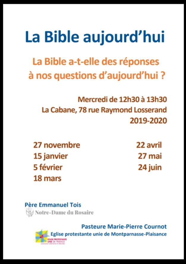 20 novembre 201923 mars 2020 Église protestante unie de Montparnasse-Plaisance La Bible aujourd’hui Mercredi de 12h30 à 13h30 La Cabane, 78 rue Raymond Losserand – 75014 Paris Père Emmanuel Tois, Notre-Dame du Rosaire — Pasteure Marie-Pierre Cournot