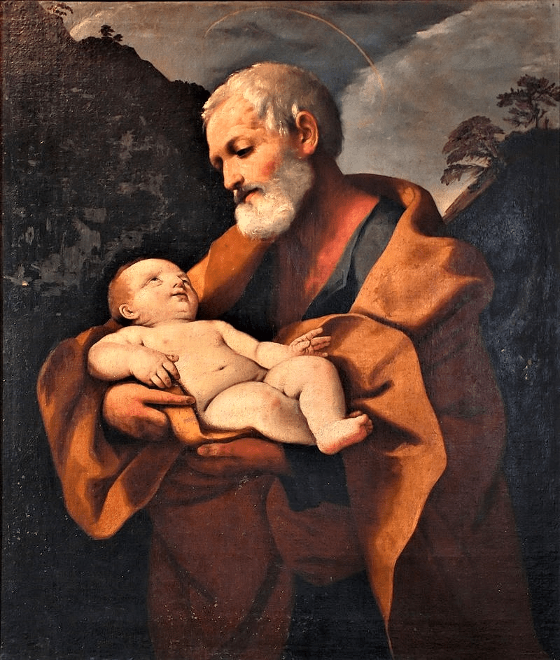 Joseph avec Jésus bébé dans les bras, Joseph est identifié comme saint, avec son auréole en or.