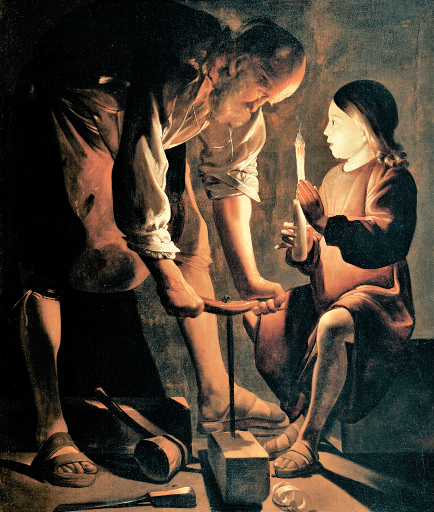 Jésus a grandi et Joseph lui apprend le métier de charpentier. Joseph perce une pièce de bois avec une espèce de grande chignole. Jésus tient la bougie qui lui illumine pleinement le visage et la lumière se répercute, dans une moindre mesure sur le visage de son père. Comme si c’était Jésus qui illuminait Joseph de son rayonnement.