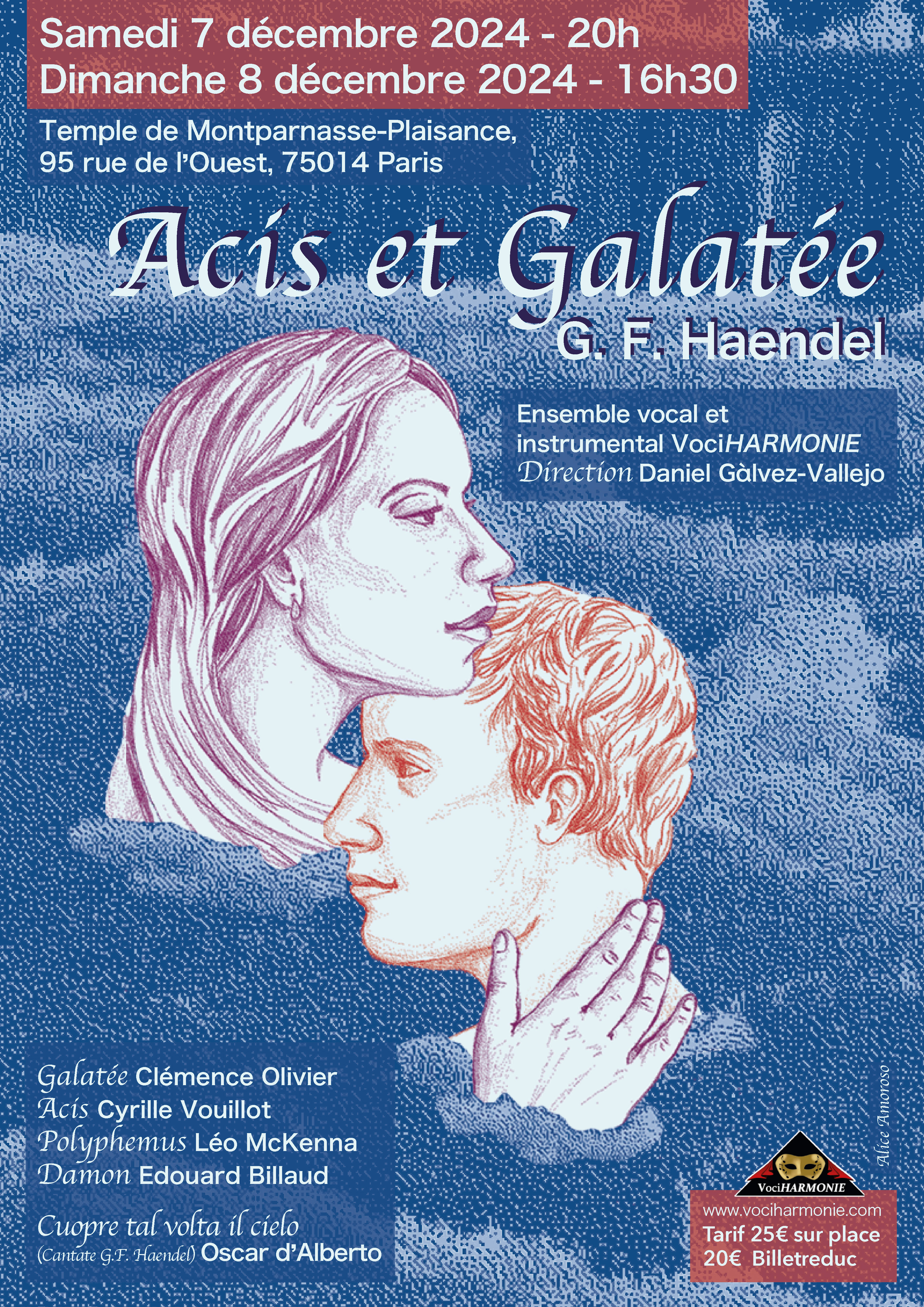 - Samedi 7 Décembre à 20h – Dimanche 8 Décembre à 16h30 : Acis et Galatée, G.F. Haendel. Ensemble vocal et instrumental VociHARMONIE, sous la direction de Daniel Galvez-Vallejo. (Tarif : 25 euros sur place, 20 euros sur Billetreduc)