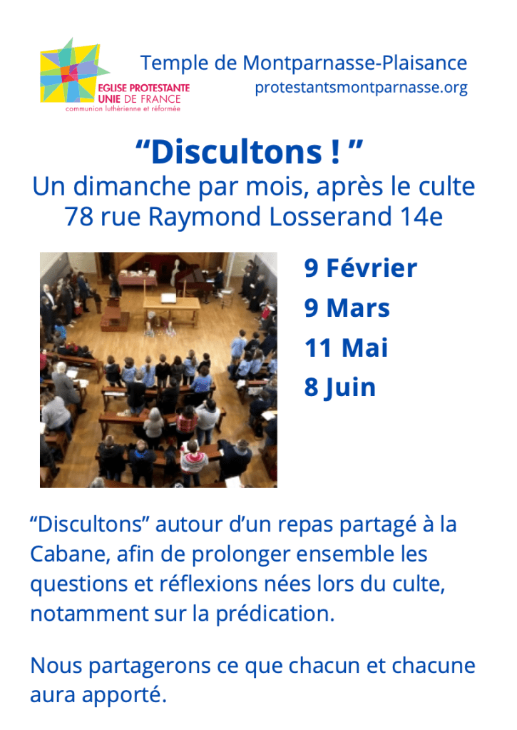 7 février 202527 mars 2025 Église protestante unie de Montparnasse-Plaisance « Discultons » après le culte !