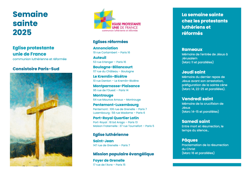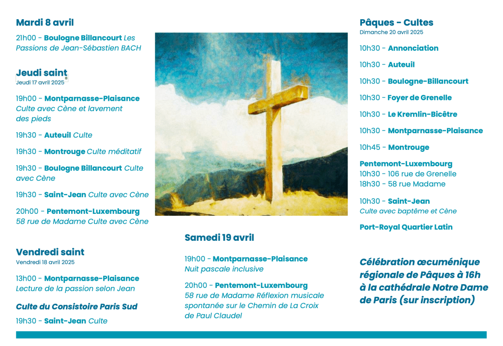 27 mars 202525 avril 2025 Église protestante unie de Montparnasse-Plaisance Les rendez-vous de la semaine de Pâques proposés par les paroisses du consistoire