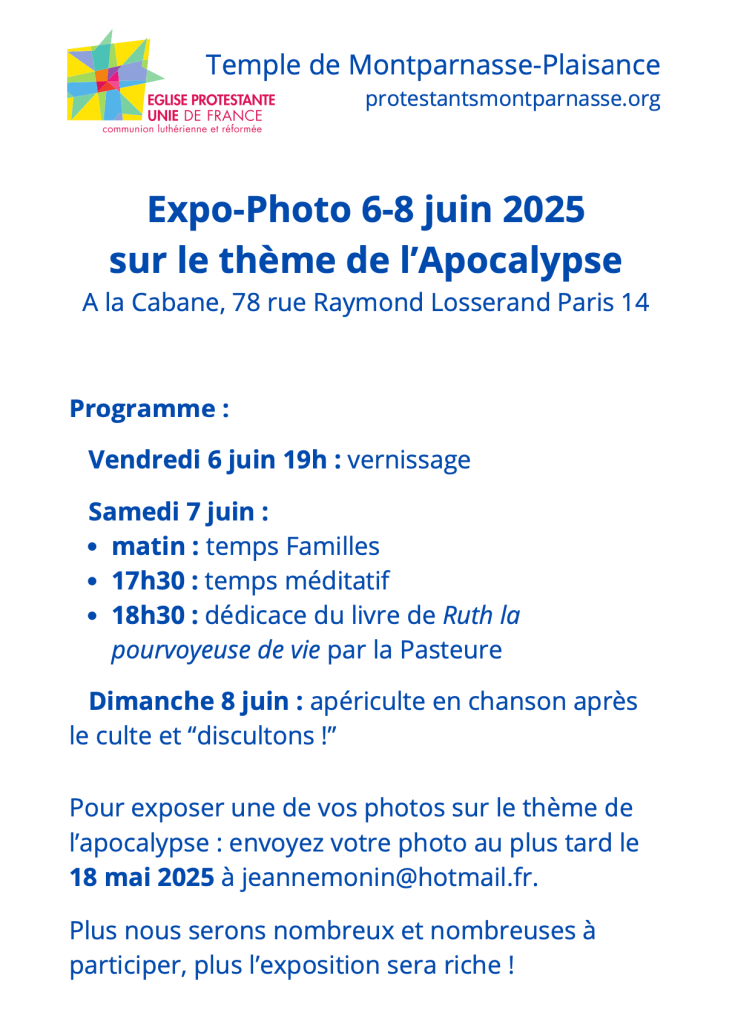 9 avril 20259 juin 2025 Église protestante unie de Montparnasse-Plaisance Expo photo sur le thème de l’Apocalypse les 6, 7 et 8 juin
