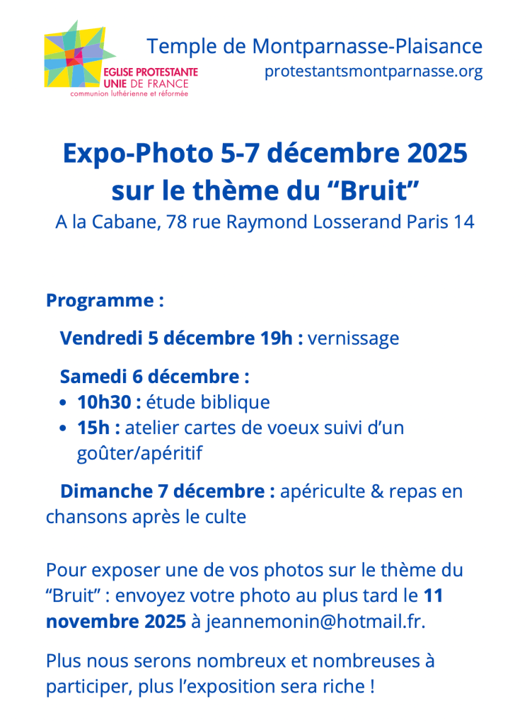 Pour exposer une de vos photos sur le thème du “Bruit” : envoyez votre photo au plus tard le 11 novembre 2025 à jeannemonin@hotmail.fr.