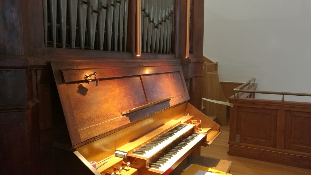 L’orgue néo-romantique, placé au milieu de la tribune, en face de la chaire, est orné d’un buffet néo-gothique. Il présente 2 claviers de 56 notes et un pédalier de 30 notes qui font parler les tuyaux par transmission mécanique. Les 15 jeux (dont 11 réels) forment la composition suivante :